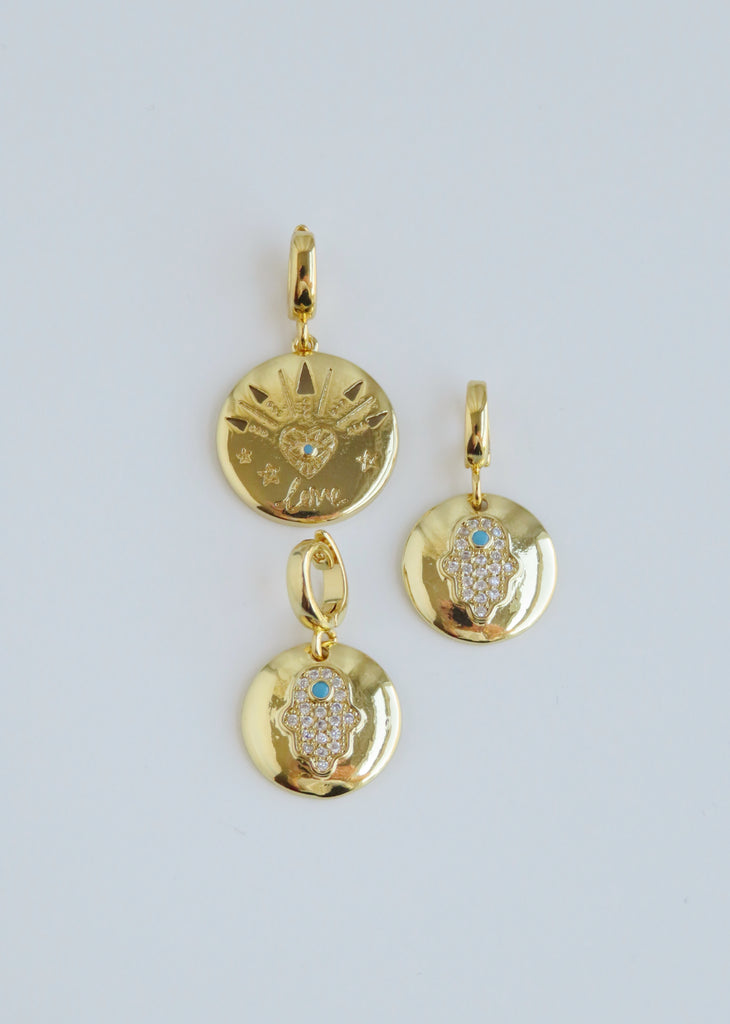 Beautiful 24k gold plated Hamsa and love charms to add to your necklace, bracelet or anklet. Each charm has a hinged clasp making it interchangeable so that you can easily clasp the charm on your own and style it the way you like!